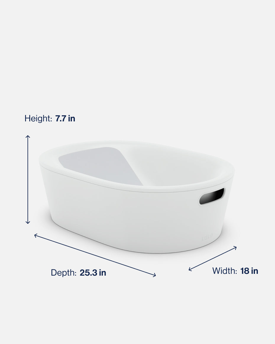 Dimensions: The Bath Tub: 25.3 x 18 x 7.7 in, Rinse Cup: 3.75 x 6.6 x 6 in, Spout Cover: 5.75 x 3 x 3.75 in, Bath Toy Bin: 9 x 5.5 x 8.5 in, Knee Saver: 17 x 11.5 x 1 in, Elbow Saver: 16 x 4.5 x 1 in