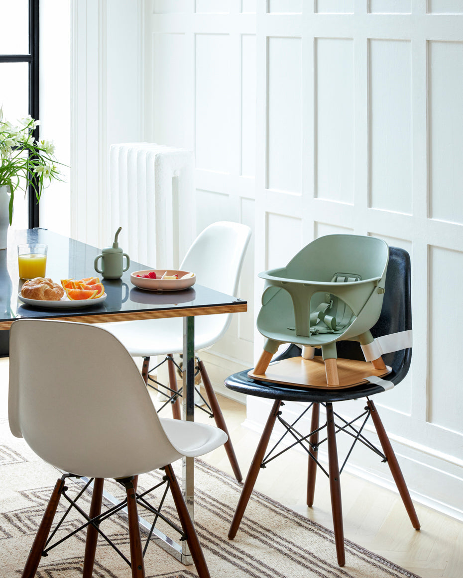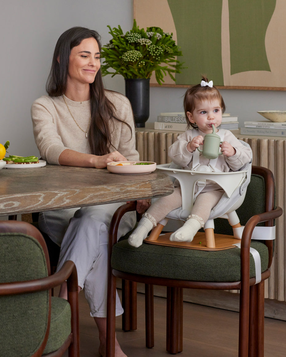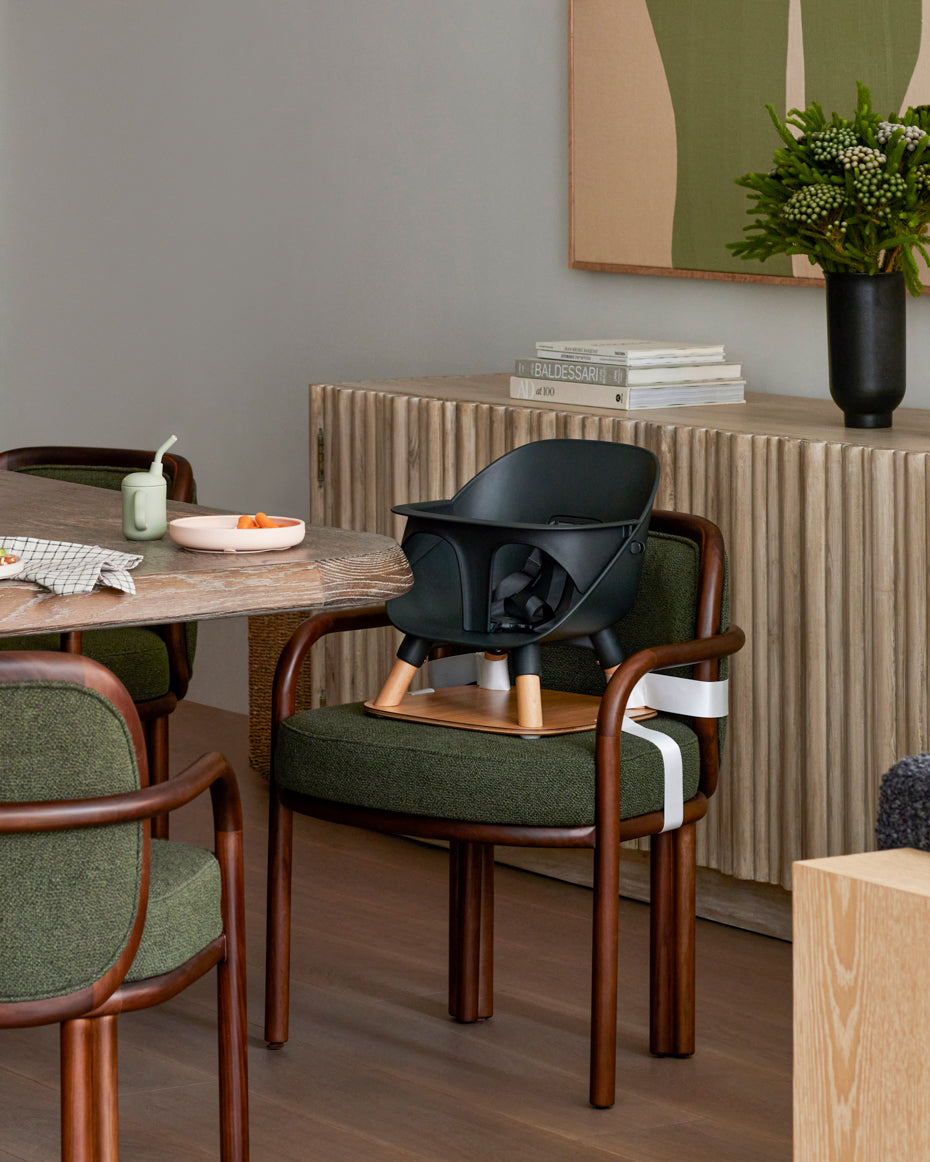 Materials: Legs + Base: Sustainably sourced FSC Certified beech wood; Seat + Belly Bar: Non-toxic plastic; Straps: Nylon